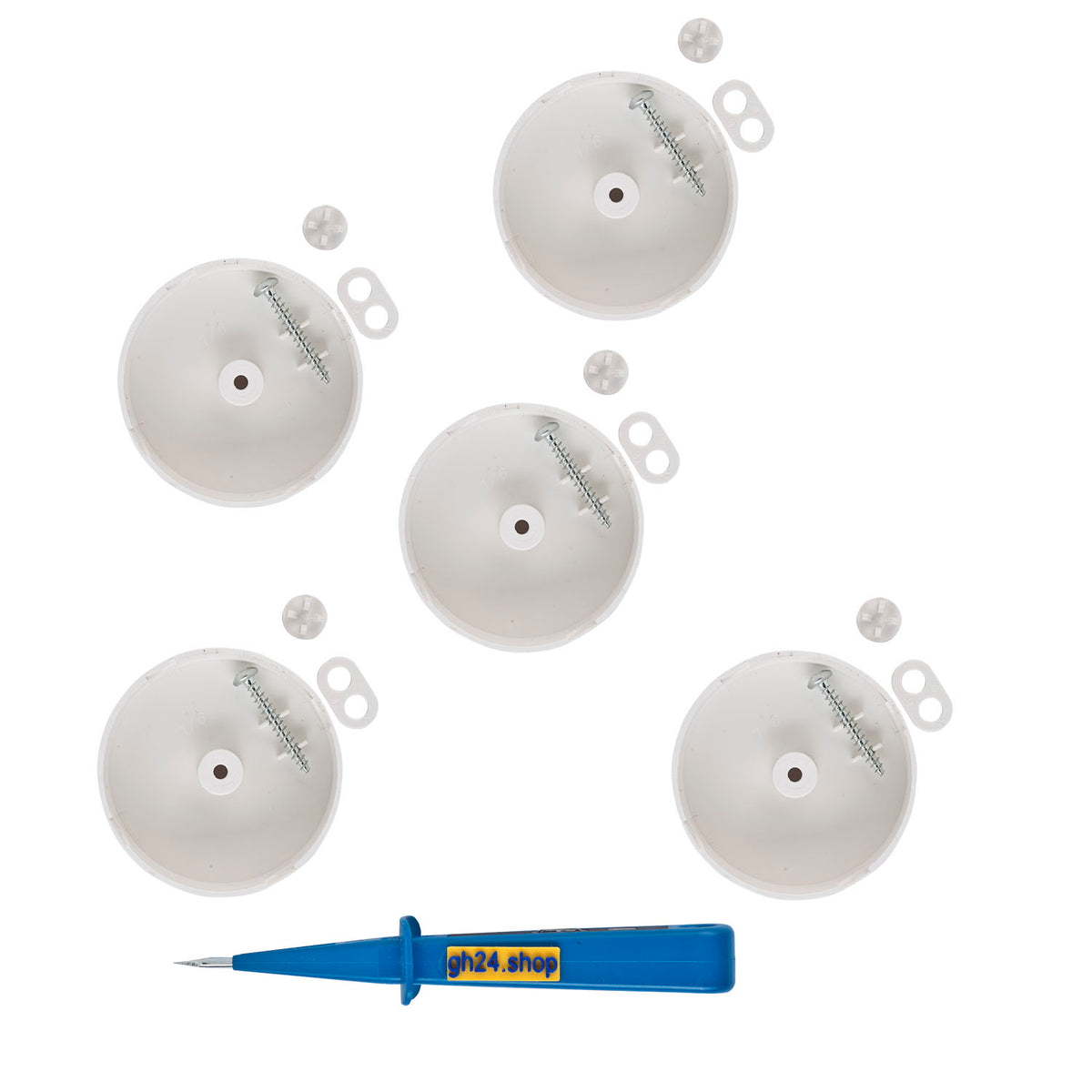 Lieferumfang: 5x Lampen-Deckenverteilerdosen mit Zugentlastungs- und Befestigungsset, 1x gh24 Phasenprüfer