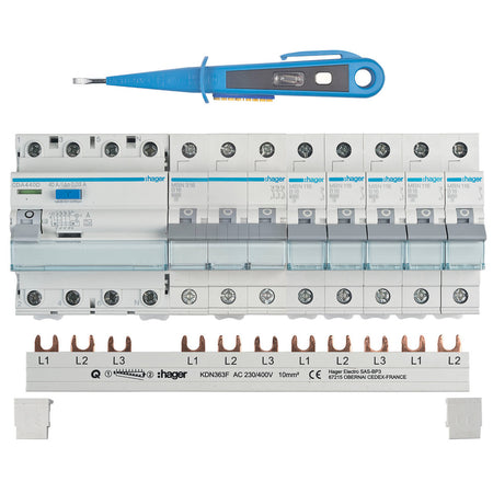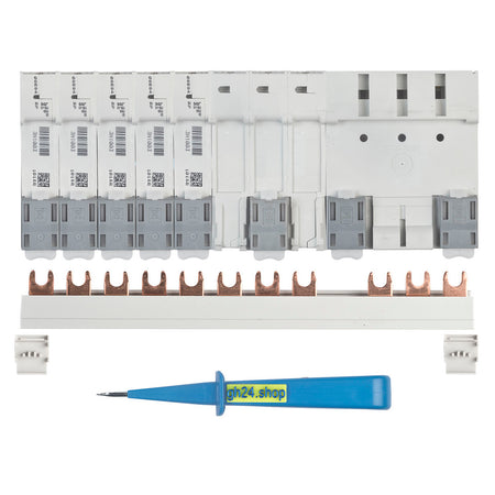 Einbaupaket Hager FI-Schutzschalter 30mA, Sicherungen B16A, Kammschiene, Endkappen und gh24 Phasenprüfer