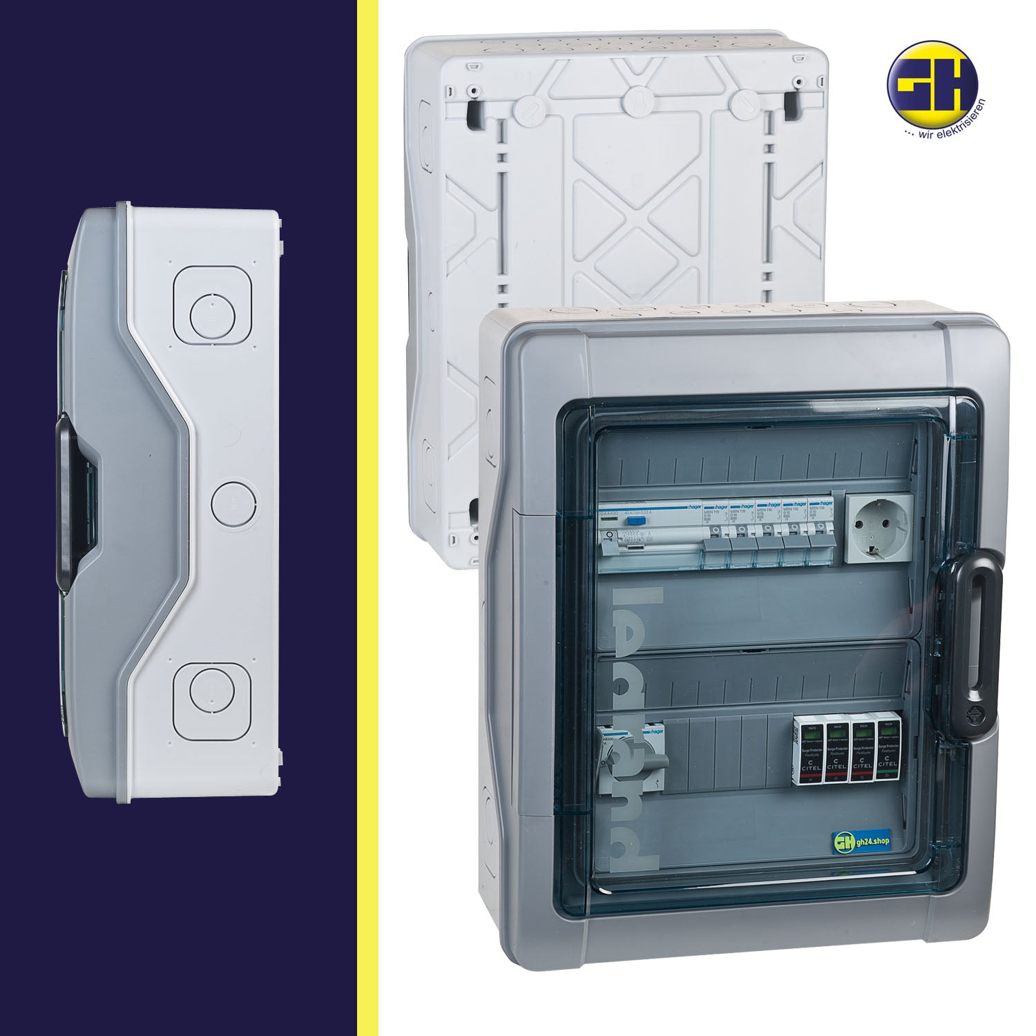 Stabiler Feuchtraum Kleinverteiler mit Schlagfestigkeit IK 09, mit transparenter Rauchglastür (Deckel mit Tür ist dreh- und damit wechselbar), zum Einbau von Schalt- und Schutzgeräten nach Maßnorm DIN 43 880 mit 70mm Einbautiefe, für Einbaugeräte bis 63A, 400V/ 50 Hz.