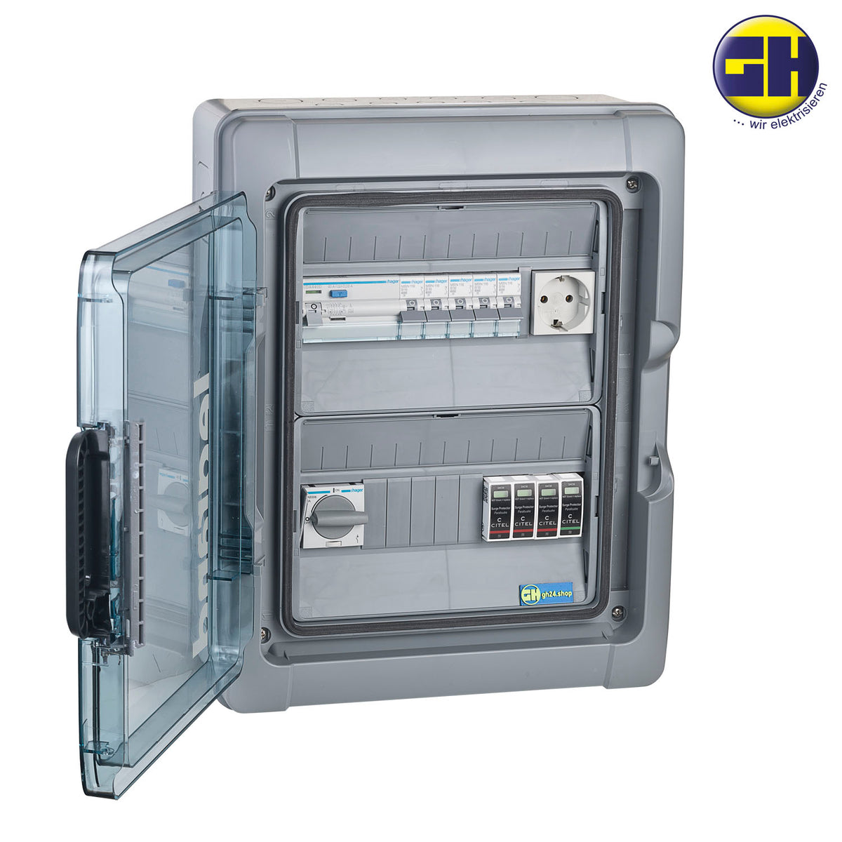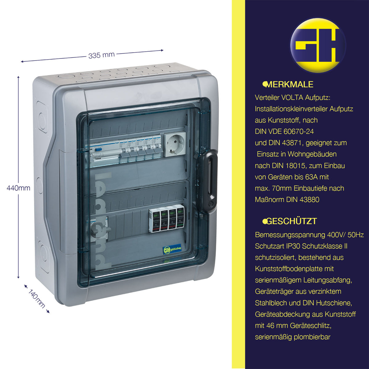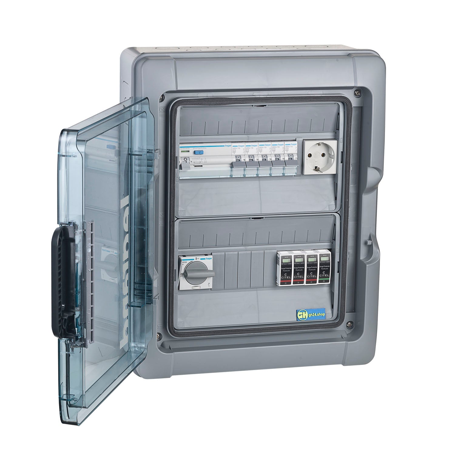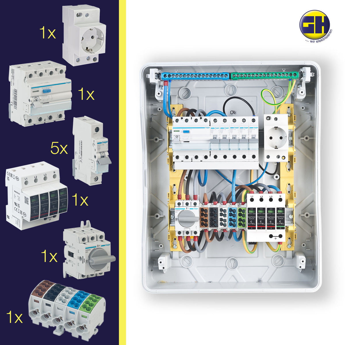 Anschlussklemme 5x25/16qmm, Lasttrennschalter bis 3x63A, Überspannungsschutz Typ 2 3P+N, Fehlerstrom-Schutzschalter 40A 30mA 3P+N, 5x Sicherungsautomat B16A 1-polig 6kA, 1x Steckdose 230V 16A.